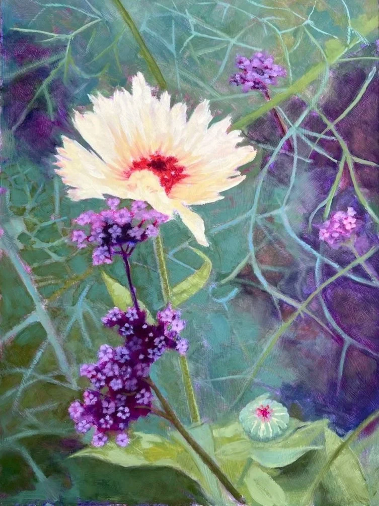 In late winter, I scatter breadseed poppy seeds in my garden, anticipating their blooms in spring. This painting focuses on a single purple poppy, set against a simplified background. The composition emphasizes the structure of the flower and the contrast between its saturated color and the surrounding space.